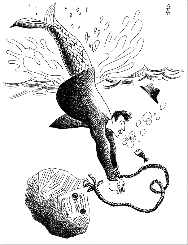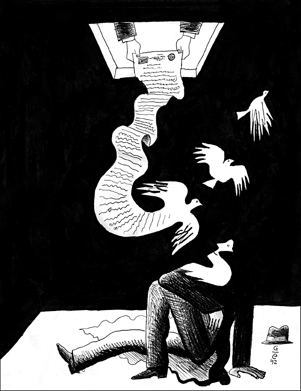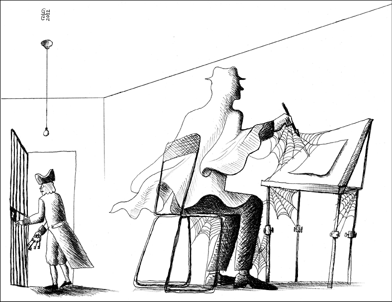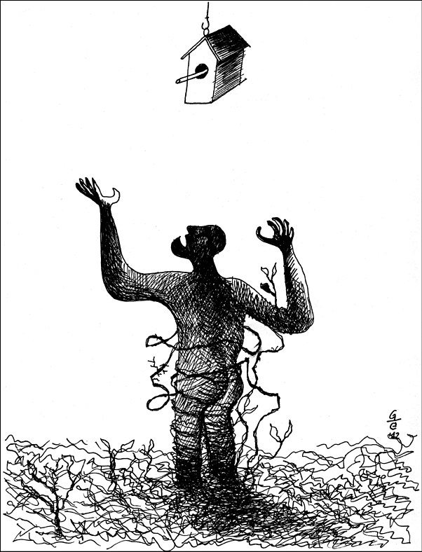 The first two drawings that came out were completely improvised, rather directionless, and (frankly) not too exciting. (Consequently, they are not shown here). But one day I was walking through a field covered by twigs, leaves, and weeds; and almost instantly the image of the man reaching out while being held back by stems popped in my head. As I drew the image when I got home, I wondered what the man was reaching out for –it immediately became clear that it was longing or yearning of some sort. I broke the rule of avoiding reasoning and I arrived at the metaphor of the bird house. Bringing this unexpected element into the image quickly and completely defined the direction I would take.