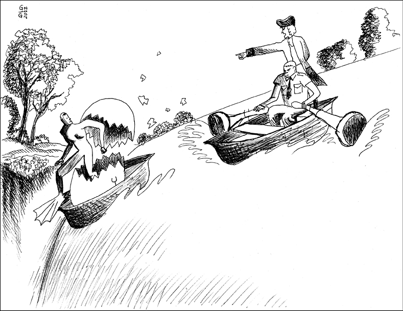 Creative thinking is rarely smooth or linear: you rarely go from point A to B to C without at least a few detours or bumps in the road. It’s precisely those detours and bumps that lead you down a previously unexplored (and hopefully worthwhile) route. By the same token, explaining something complex you’ve been through is not always easy or clear-cut, regardless of the medium you’re using. Being Argentine by birth and living in the US for now close to two decades, I’ve gone through a long process of adaptation and assimilation that most (if not all) immigrants go through when they leave their homeland to start their lives anew somewhere else. As I moved onto the next daily drawing (which was of the man stepping off a boat and having his arms tied up by a papyrus), the idea of making a series of drawings that deal with this experience emerged.